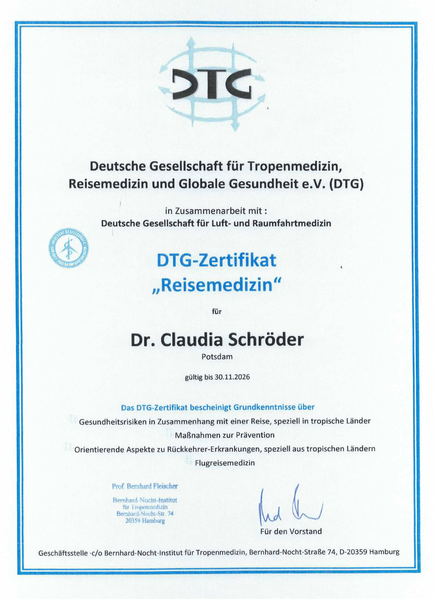 DTG-Zertifikat Dr. Claudia Schröder, ReisemedizinSie wollen verreisen? Frau Dr. Claudia Schröder hat die Antworten zu länderspezifischen Gesundheitsrisiken und Empfehlungen für Impfungen.